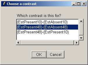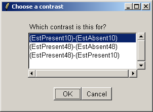The "Advanced" button can be used to enter the contrasts as a matrix or to see the corresponding contrasts matrix obtained from the paris of arrays selected. The number of pairs of drop down combo boxes is chosen to be one less than the number of unique targets in the Target column of the Targets file as long as this does not exceed ten pairs in total. For now, this total number of contrasts must be the same for all contrasts parameterizations, but you can just leave some of the blank if desired. For example, you may choose to use only one comparison, EstPresent10 vs EstAbsent10.