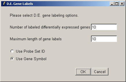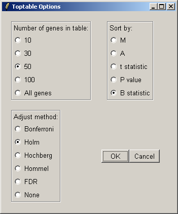 You can specify the number of genes you want to display in the table. If you want to display all genes, the table will be shown in a text window, because the usual spreadsheet/table window is too slow in this case. If you have replicate arrays, you will be able to sort by the B statistic, the moderated t statistic or the P-value. The B statistic is the recommended statistic used for sorting genes. The adjust method is used to correct the P-value for multiple testing error. The default method is that of Holm (1979), but other methods such as False Discovery Rate (FDR) are available.