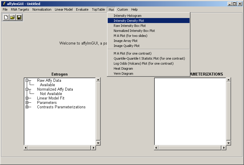 The left status window now reflects the fact that normalization is complete. For users who are familiar with some R commands, the raw and normalized data objects are available as "RawAffyData" and "NormalizedAffyData" in the "Evaluate R Code" window, found in the "Evaluate" menu.