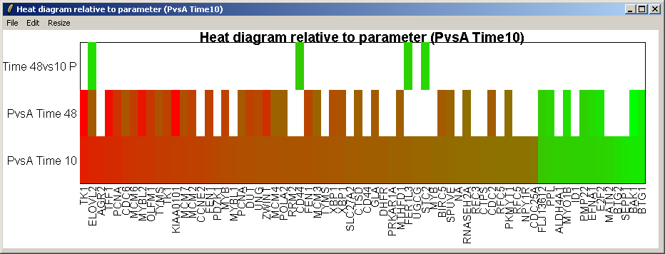 The resulting heat diagram is shown above. The contrast which the heat diagram is plotted relative to is shown at the bottom. This diagram shows which other genes are up-regulated or down-regulated when this genes expression changes from its most down-regulated state (green) to its most up-regulated state (red) within this differentially expressed subset of genes.