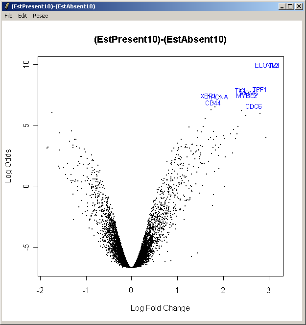 Now from the Plot menu, select "Log Odds (Volcano) plot (for one contrast)". Select the first contrast, (EstPresent10)-(EstAbsent10).