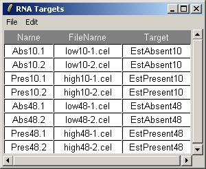 The RNA Targets can be viewed after having been loaded into affylmGUI using the "RNA Targets" menu.