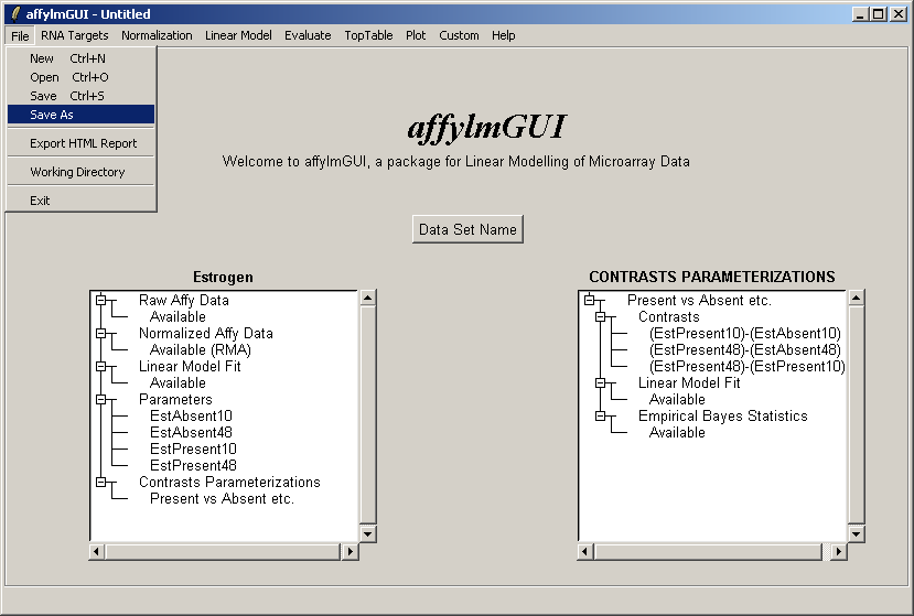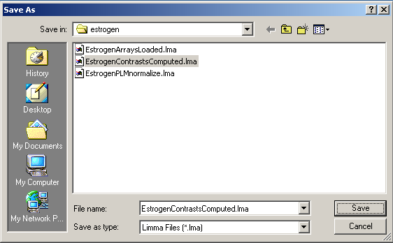 If you haven't already done so, you should save your work, by selecting "Save" from the File menu. This will save a binary RData file with the extension ".lma" (Linear models for MicroArrays).