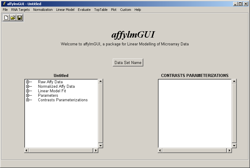 The main window of affylmGUI is shown above. From the File menu, click on "New" to begin a new analysis.