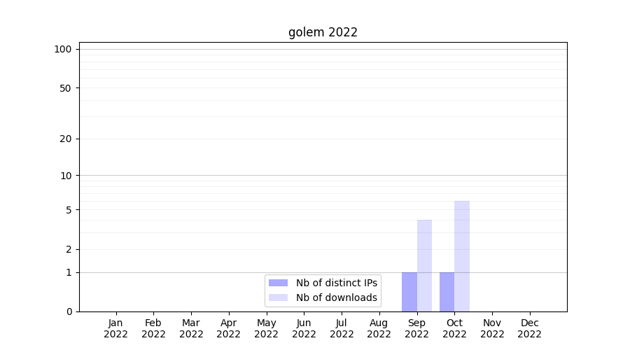 Number of downloads for workflow package golem, year by year, from 2023 back to 2015 (years with no downloads are omitted):