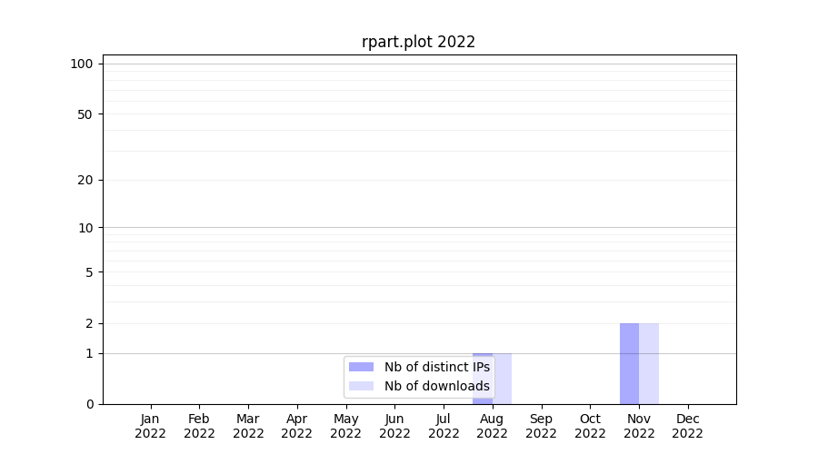Number of downloads for workflow package rpart.plot, year by year, from 2023 back to 2015 (years with no downloads are omitted):