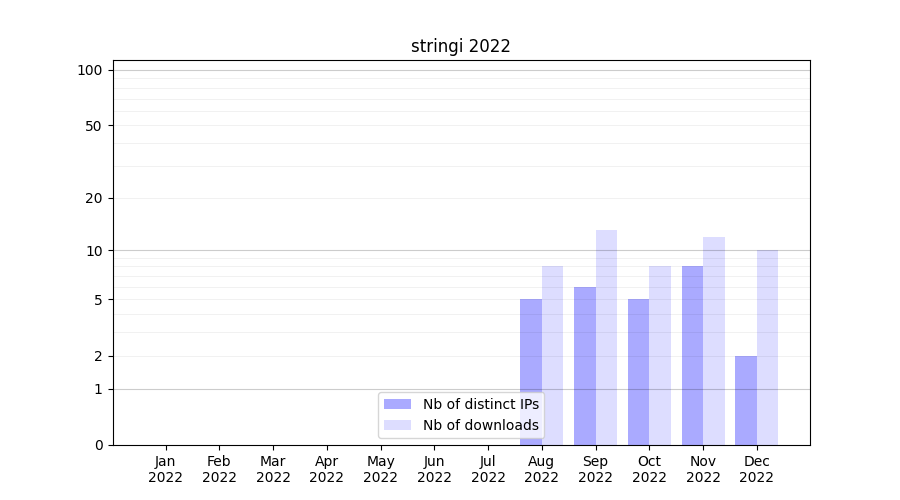Number of downloads for workflow package stringi, year by year, from 2023 back to 2015 (years with no downloads are omitted):